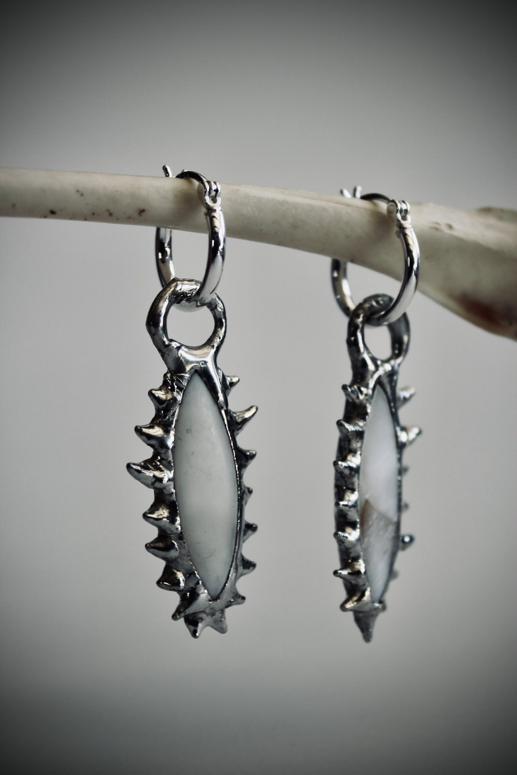 Spiked Lead-Free Soft Soldered White Fresh Water Shell Charms with Sterling Silver Hoop Earrings.
